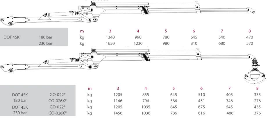 Die herausragenden Arbeitsleistungen des Krans DOT 45K werden durch den viergelenkigen K-Mechanismus an der Verbindung zwischen Hubarm und Schwenkarm gewährleistet. Für sichereres und optimaleres Arbeiten sind alle Hydraulikschläuche integriert und somit in den Hub- und Schwenkarm des Krans geschützt. Eine Besonderheit des Krans ist die Wahl des Antriebs: