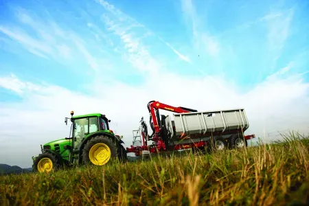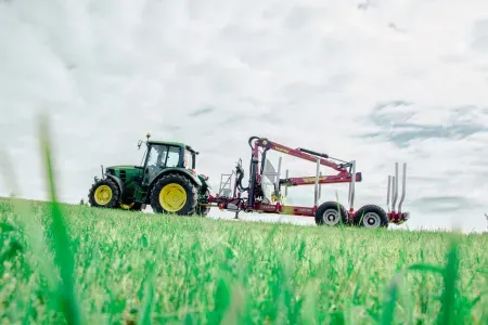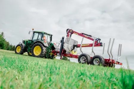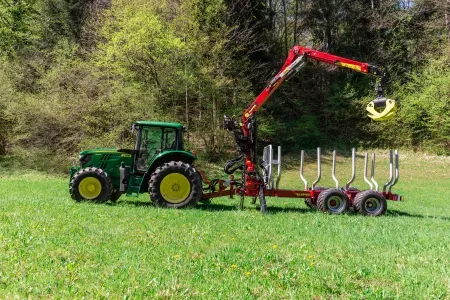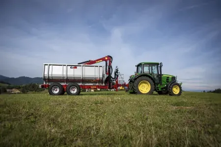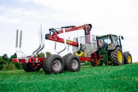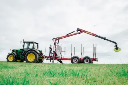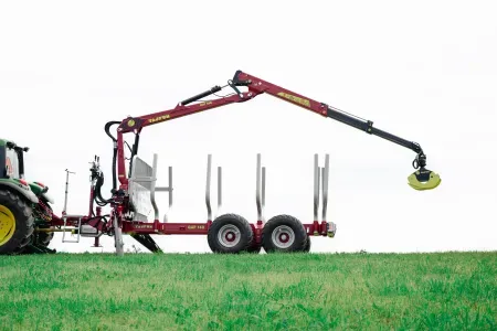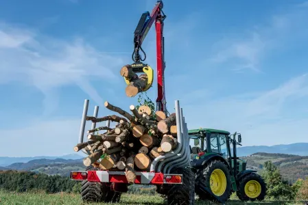 Gozdarske prikolice Tajfun so na voljo tudi v kompletu z izbranim hidravličnim dvigalom DOT